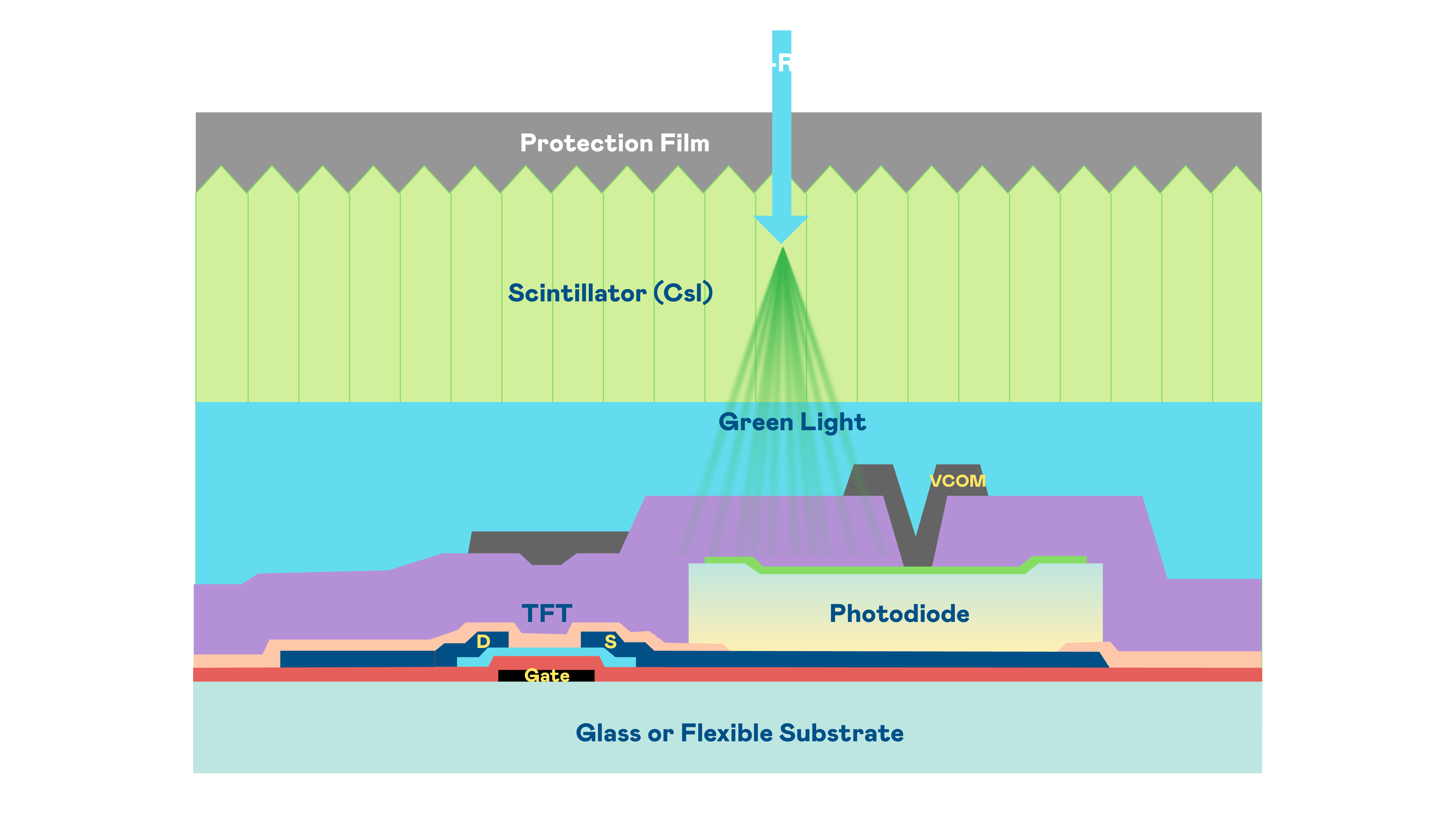 利来w66国际的X光影像感测阵列使用薄膜电晶体 (TFT) 作为每个像素的读取开关,搭配光电二极体(Photodiode)的光电转换元件,用以感测X光影像讯号。